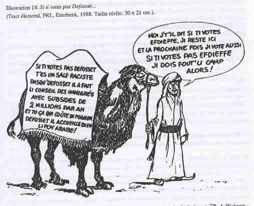 reproductions de tracts extraites de: Oriane de Biolley, La vie politique des communes bruxelloises et l'immigration - l'argument "immigrés" dans les campagnes communales (1970-1988), Louvain-la-Neuve, Editions Academia, collection Sybidi Papers n°18, 1994